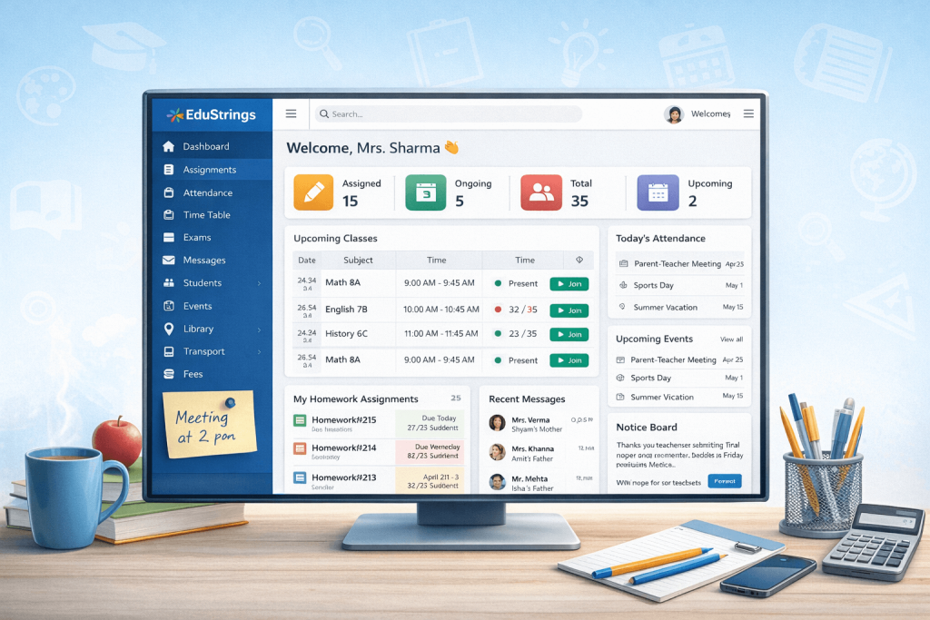 The educational foundation of every school depends upon teachers who use technological tools to enhance student learning while they maintain efficient time management. The teacher has three main duties, which include work assignment and attendance tracking and examination administration. The teacher modules of EduStrings ERP provide users with simple tools to complete their tasks. The teacher module ensures parents receive current information while school management can better connect with parents. The teacher module provides access to these important tasks, which can be performed by teachers.