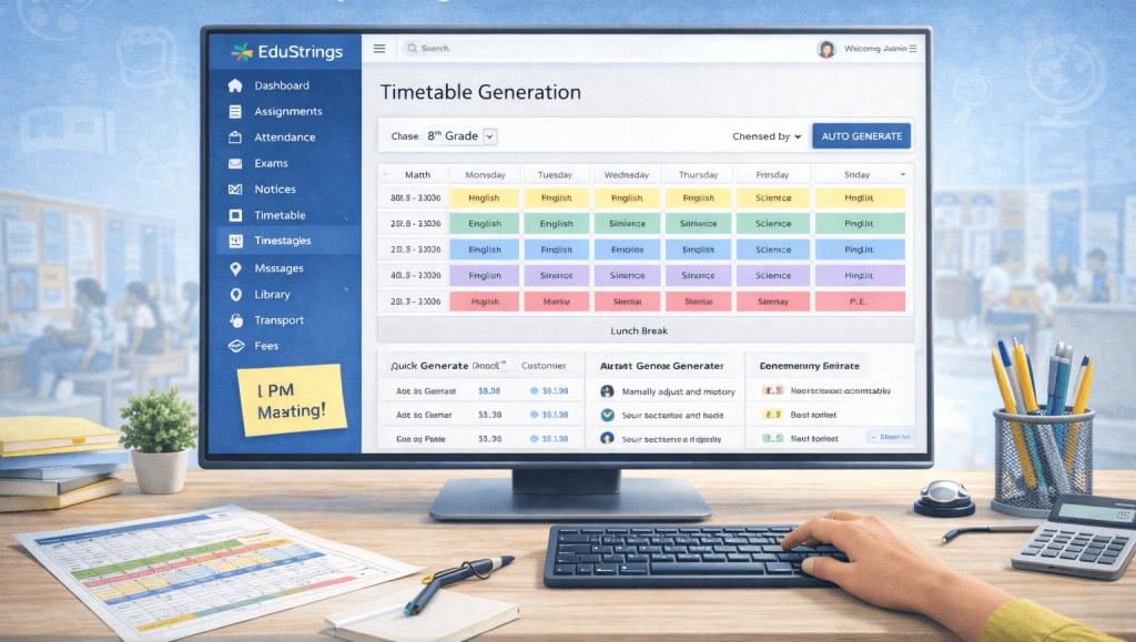 Another work which required lot of effort and staff time is making time table, making sure that all staff members are efficiently utilized and have different time slots can be very difficult and error prone. EduStrings ERP provide automatic time table generation with user friendly selection of subject and teacher. The software generates timetable schedules by using teacher skills and available timeslots which ensures that teachers will not have any schedule conflicts. Some of the key features of timetable module is listed below.